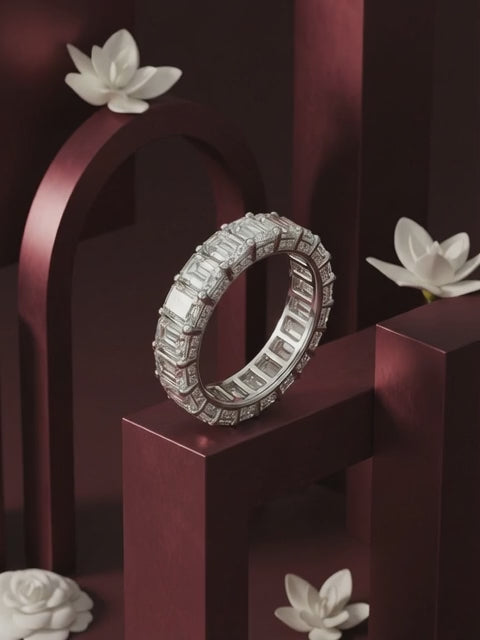 The Maison Eternity Band is a statement of enduring elegance. Featuring a continuous row of emerald-cut diamonds, each stone is precisely set to create a seamless line of light around the finger.
