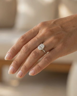 The Lina Ring is defined by balance—a striking center stone set in polished white gold, designed to maximize brilliance within a clean, modern silhouette.