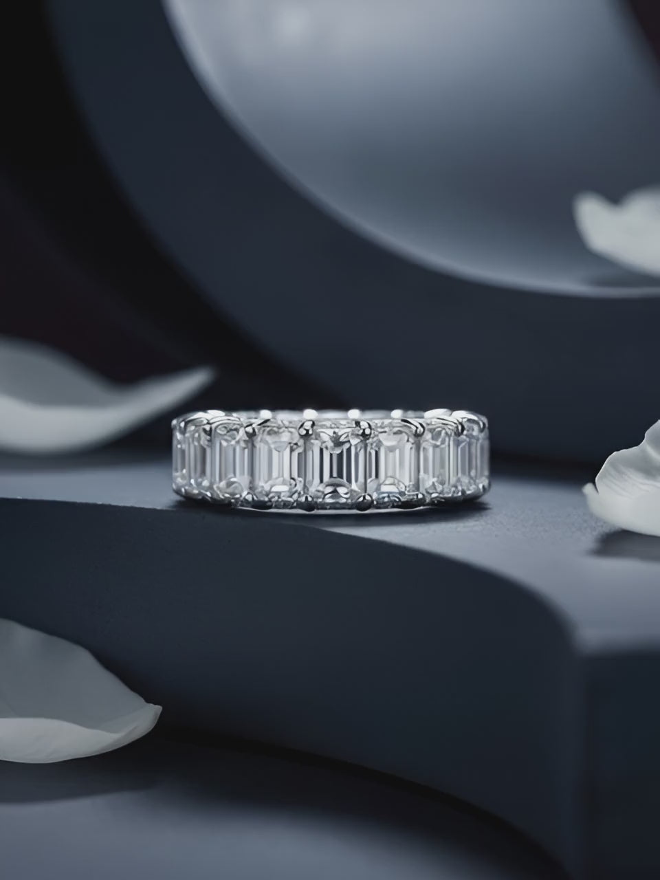 The Maison Eternity Band is a statement of enduring elegance. Featuring a continuous row of emerald-cut diamonds, each stone is precisely set to create a seamless line of light around the finger.